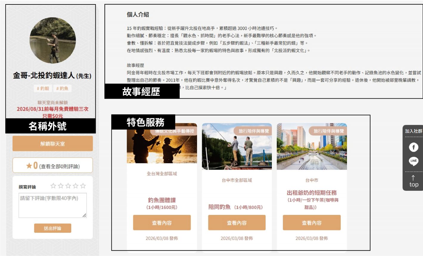 陪伴與生活服務有些服務是陪伴型的,例如陪同釣魚、陪同散步、陪伴聊天、分享人生故事,讓人與人之間重新建立連結。