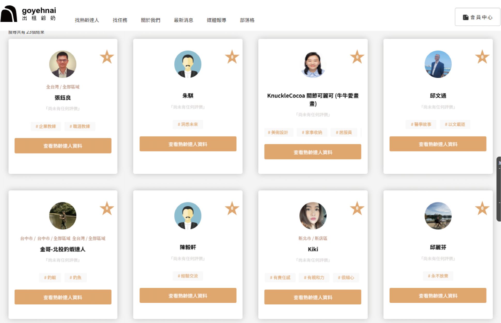 在出租爺奶平台上,熟齡工作者可以建立自己的個人頁面,介紹自己的專長、經歷與故事。透過平台的媒合機制,個人、家庭或企業都可以找到適合的熟齡職人,進行各種形式的合作。