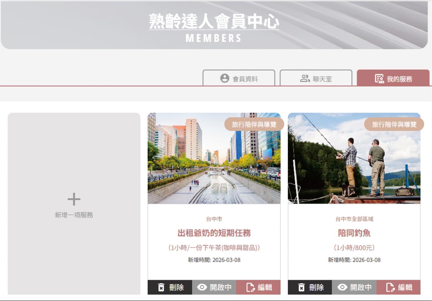 在「我的服務」頁面中可以新增服務,對你(熟齡達人)有興趣的社會大眾(業主)能知道你所提供的服務有什麼,每小時多少錢(或是以咖啡餐飲等其他方式交易)。